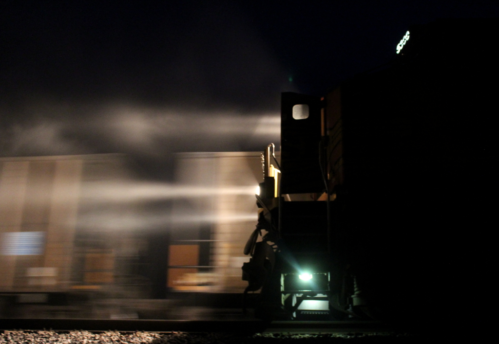 On a chilly night, an empty coal train rolls into the siding in Seymour passed a loaded coal train as it holds the main. The headlights of the locomotive on the point reveal large amounts of dust being kicked up by the empty as its rolls steadily by.